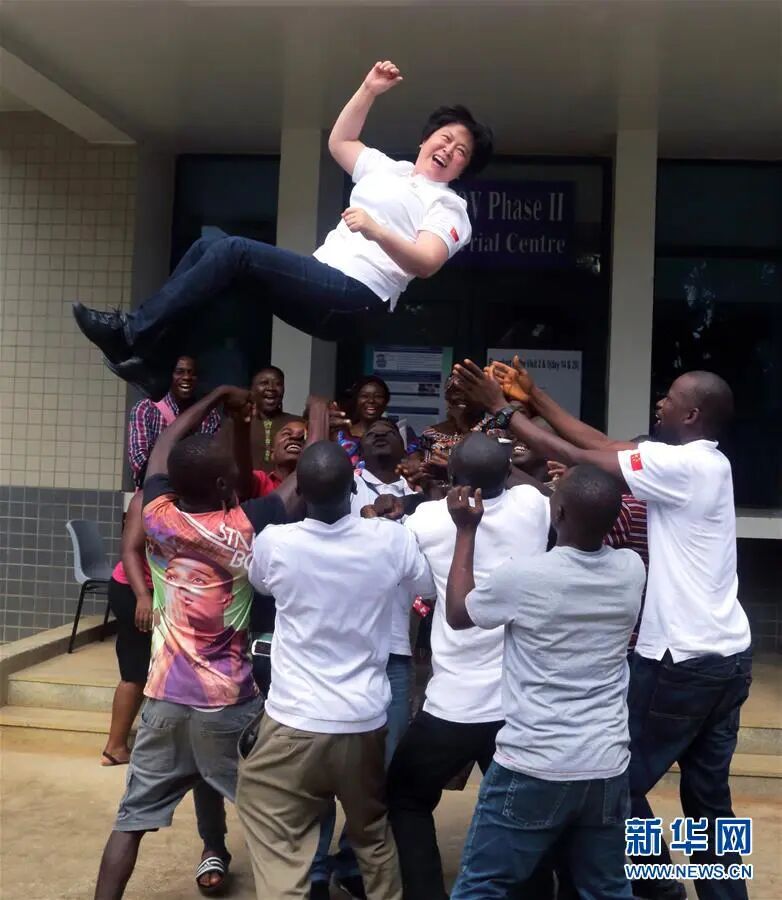 当地医务工作者兴奋地把陈薇抛向空中,庆祝埃博拉疫苗在非洲开展临床试验取得成功(2015年11月10日 张学文摄)