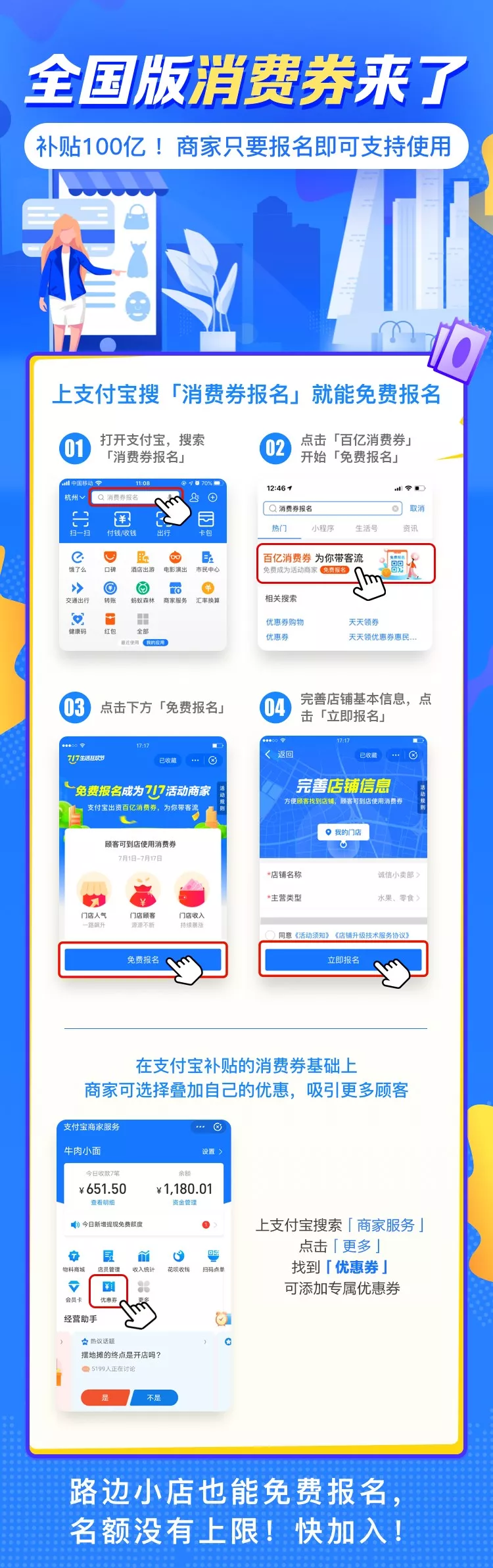 7月1日起,支付宝会连发17天消费券,全国跨城通用。此次发券补贴总规模高达100亿。这也是消费券的首次全国性动作,支持全国通用,今天开始,商家可上支付宝搜「消费券报名」,完成报名后,大家7月就能去用了。