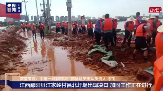 鄱阳县江家岭村的昌北圩堤出现决口,目前水位仍在不断上涨,圩堤加固加高工作正在进行中。
