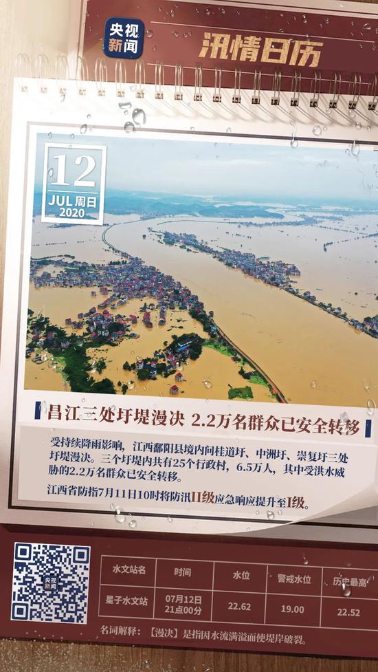 此外,截至7月12日7时,江西饶河鄱阳站水位突破1998年历史极值22.61米,达到22.74米,超出1998年的历史极值水位0.13米;