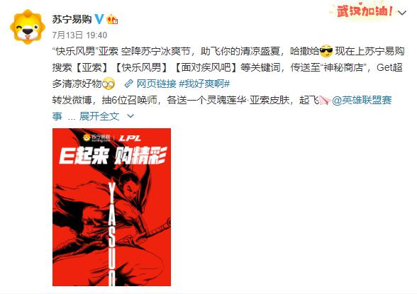 7月13日,苏宁易购官方微博发布消息称,LPL代言人亚索亮相苏宁冰爽节,将和苏宁“E起”为广大用户及粉丝创造快乐。打开苏宁并搜索“亚索”、“快乐风男”或“面对疾风吧”,均可进入冰爽节亚索主题会场,领取召唤师福利。