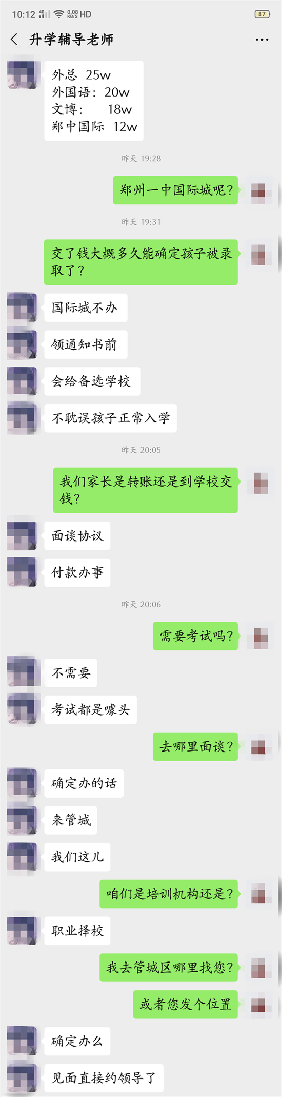 对于录取的费用,该人士表示,“学校不同价位不同。”随后将一些可以“操作”入学的学校名单发过来,并明码标价告诉记者,“中原区郑州外国语初中总校25万,高新区郑州枫杨外国语学校20万,金水区河南省实验文博学校18万,高新区郑中国际学校12万。”