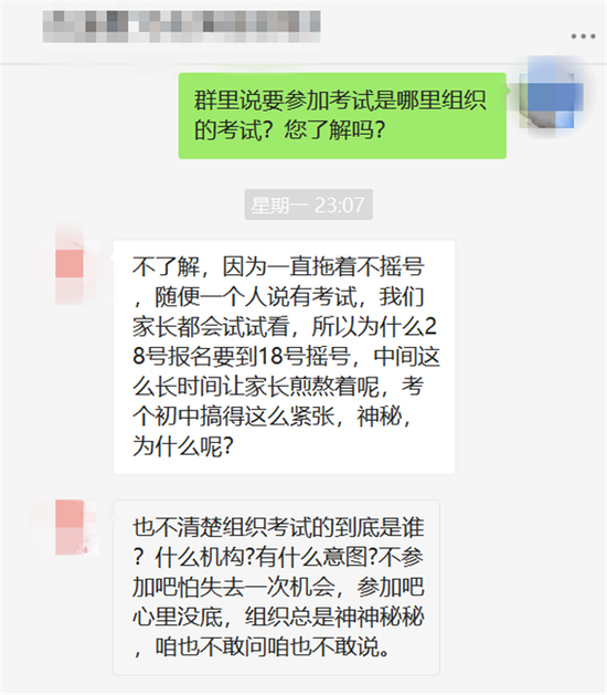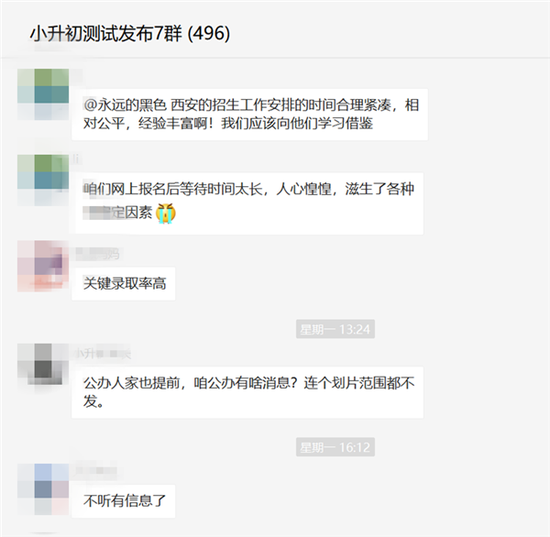 近日,记者被家长拉进一个名为“小升初测评发布群”中,该群显示已经有近500人,家长告诉记者,相同性质的群这已经是第七个了。群主对于陌生的入群者很是警惕,一般不会再群里说太多,都是和家长私下聊。