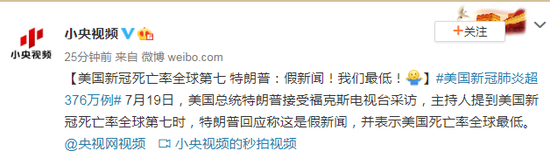 7月19日,美国总统特朗普接受福克斯电视台采访,主持人提到美国新冠死亡率全球第七时,特朗普回应称这是假新闻,并表示美国死亡率全球最低。