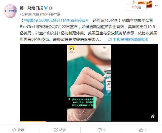 德国生物技术公司BioNTech和辉瑞公司7月22日宣布,如候选新冠疫苗安全有效,美国将支付19.5亿美元,以生产和交付1亿剂新冠疫苗。美国卫生与公众服务部表示,依协议美国可再买5亿剂疫苗。该疫苗将免费提供给美国人。