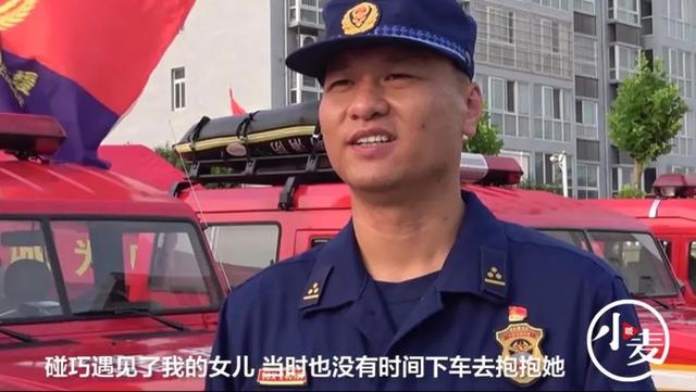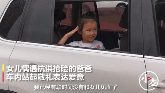 下午6时左右,忙碌一天的抗洪抢险突击队员李昂,坐上消防救援车赶往下一个任务点的时候,在路上迎面遇见了妻子开车经过,在两车相交会的瞬间,女儿落下车窗,不停得向着消防员爸爸挥手,并用稚嫩的小手给爸爸一个标准的敬礼。