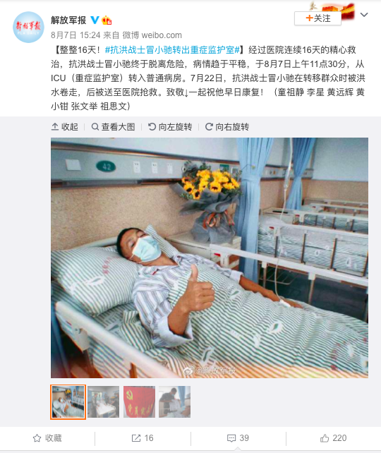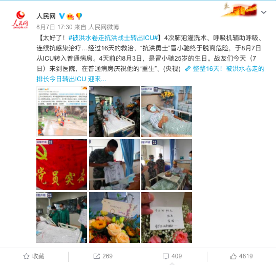经过16天的救治,“抗洪勇士”冒小驰终于脱离危险,于8月7日从ICU转入普通病房。
