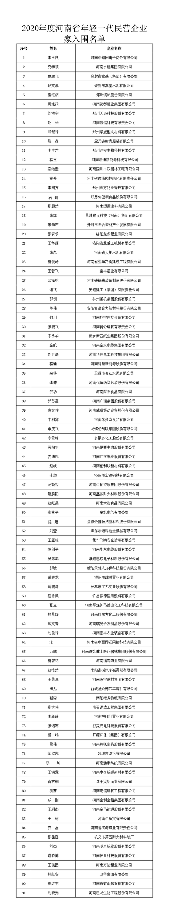 8月11日,河南省工业和信息化厅、中国共产主义青年团河南省委员会公布《关于2020年度河南省年轻一代民营企业家入围名单的公示》。我省91名年轻企业家入围。