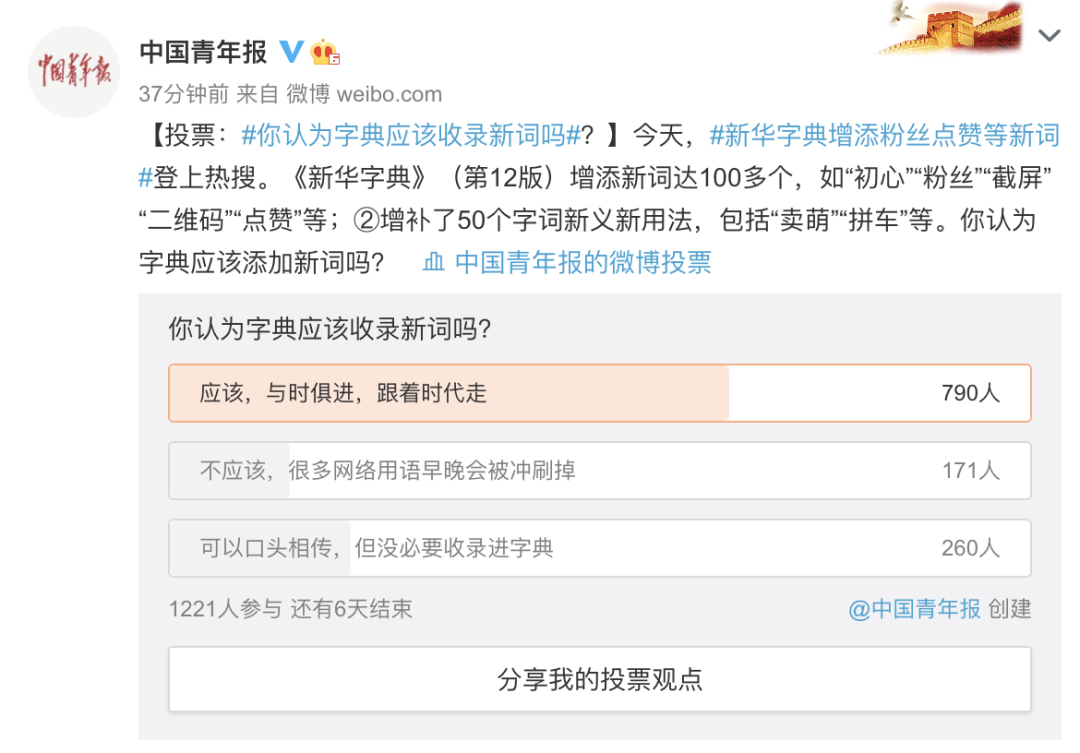 在@中国青年报 发起的一项投票中,大部分网友认为《新华字典》应该收录新词↓