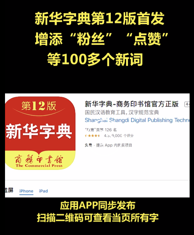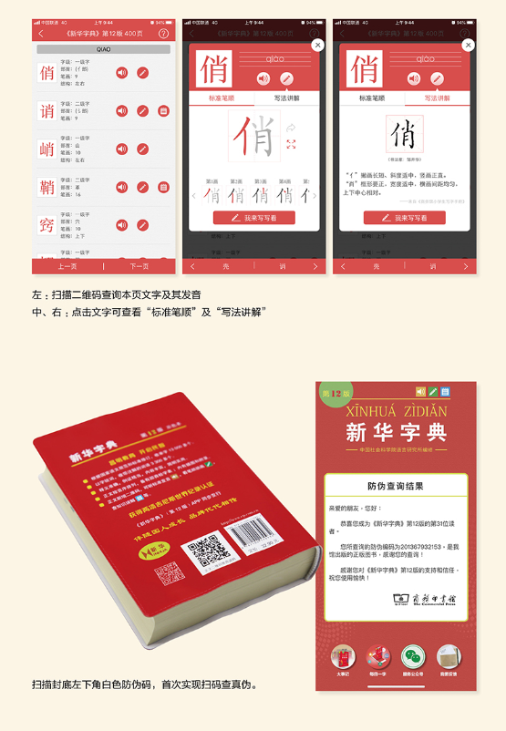 经过本次修订,《新华字典》(第12版)在科学性、规范性和实用性等方面跟进社会发展,更加适合新时代读者的需要。同时,首次使用冷激光打码技术,通过一书一码,让《新华字典》有了电子“身份证”,为读者提供了防伪查询、物流追溯、资源链接等等增值服务。此外,《新华字典》(第12版)首次实现应用程序APP和纸质图书同步发行。