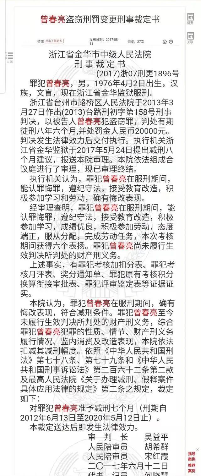 随后,曾春亮因再犯盗窃罪,被判处有期徒刑8年6个月,并处罚金2万元,刑期从2012年6月13日至2020年12月12日止。后因在服刑期间有悔改表现,被金华市中级人民法院准予减刑七个月,刑期至2020年5月12日止。