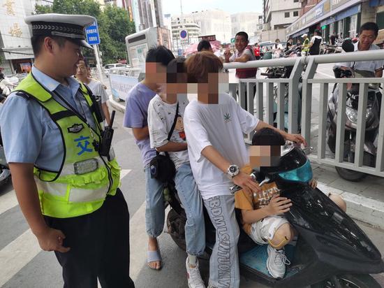 2020年8月13日下午17:20左右,郑州交警三大队车站一中队中队长王杨和辅警王帅正在福寿街兴隆街路口执勤,一辆电动车晃晃悠悠从北边骑行过来,仔细一看,一辆小小的电动车上挤了四个人,辅警王帅赶忙拦下来。