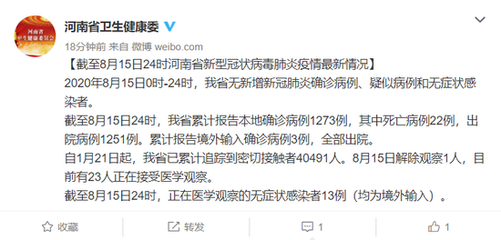截至8月15日24时,我省累计报告本地确诊病例1273例,其中死亡病例22例,出院病例1251例。累计报告境外输入确诊病例3例,全部出院。