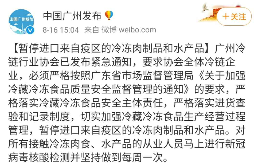 广州冷链行业协会已发布紧急通知,要求协会全体冷链企业,必须严格按照广东省市场监督管理局《关于加强冷藏冷冻食品质量安全监督管理的通知》的要求,严格落实冷藏冷冻食品安全主体责任,严格落实进货查验和记录制度,切实加强冷藏冷冻食品生产经营过程管理,暂停进口来自疫区的冷冻肉制品和水产品。对所有接触冷冻肉食、水产品的从业人员马上进行新冠病毒核酸检测并坚持做到每周一次。