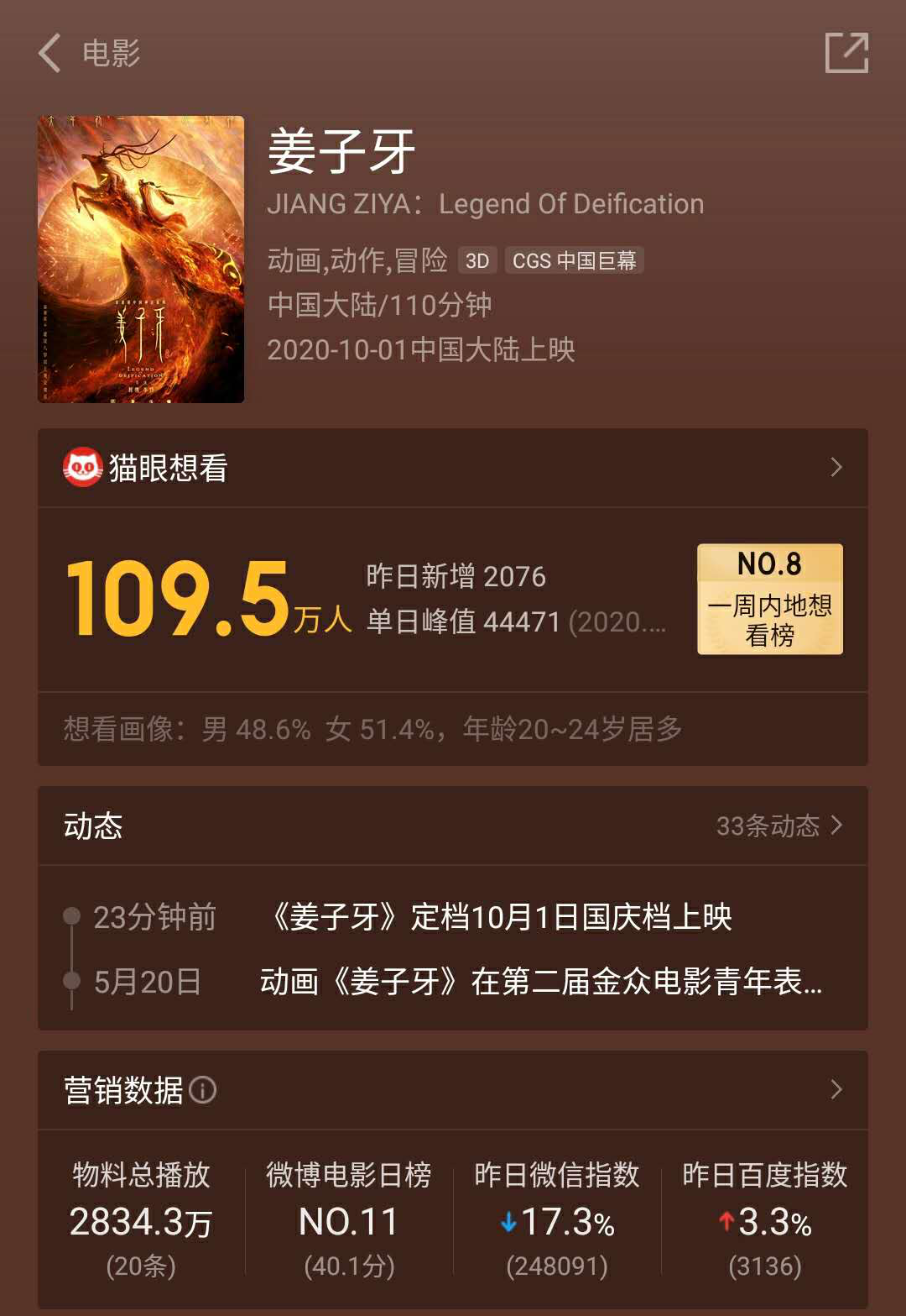 8月16日,电影《姜子牙》通过官微宣布,定于今年10月1日公映。