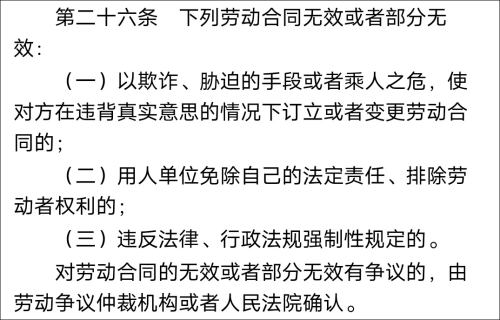 《中华人民共和国劳动合同法》第二十六条规定,下列劳动合同无效或者部分无效: