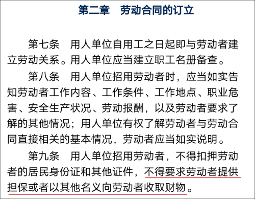 并且,《中华人民共和国劳动合同法》第九条规定,用人单位招用劳动者,不得扣押劳动者的居民身份证和其他证件,不得要求劳动者提供担保或者以其他名义向劳动者收取财物。