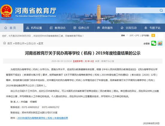 河南民办高校(机构)检查结果公布 这些不合格》 河南省教育厅日前对民办高等学校(机构)2019年度检查结果予以公示,有5家机构不合格,1家机构停办。鹤壁汽车工程职业学院 洛阳科技职业学院 南阳职业学院