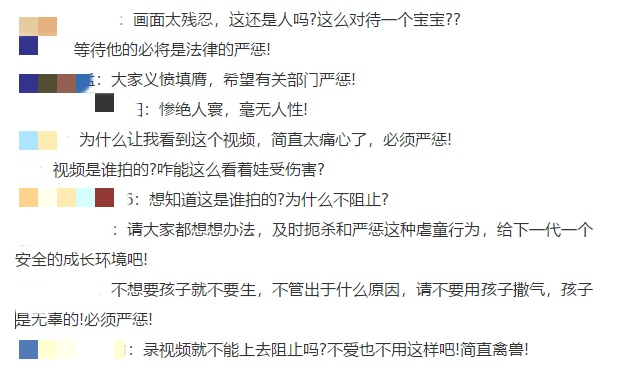 也有网友认为,拍视频的人也有推脱不掉的责任。男子对孩子下死手,不管是谁在旁边,都应该全力去阻止,“这个时候拍视频真不知道是咋想的”。对于网传孩子妈妈为拍摄者的说法,记者没有得到证实。此外,该视频是如何流传开的,警方没有说明。