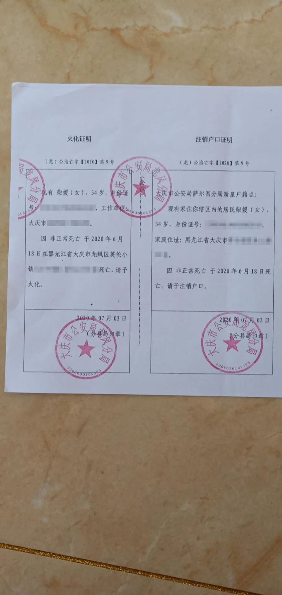 7月3日,大庆市公安局龙凤分局出具了柴媛的火化证明,证明上写道:“因非正常死亡,于2020年6月18日在黑龙江省大庆市龙凤区英伦小镇C22号楼”的一间房屋内死亡。