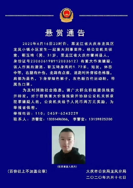 记者发现,柴芳所说的杀害其妹妹的凶手靳某琦并不是第一次作案。6月17日,大庆市公安局龙凤分局曾经对外发布悬赏通告,通告中称,6月16日23时许,大庆市龙凤区龙凤小镇小区内发生一起重大刑事案件,靳某琦有重大作案嫌疑,对于提供重大价值线索并协助公安机关抓获犯罪嫌疑人的,公安机关给予2万元人民币奖励。