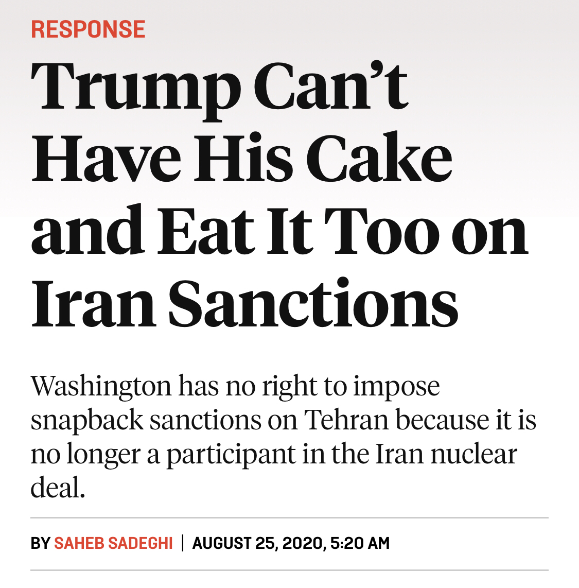 美国《外交政策》杂志伊朗问题专栏作家也认为,美国的论点站不住脚。且不管美国已经退出了协议,即便要启动快速恢复的机制,也是协议各国解决争议最后的手段,且事实上是美国最早违背了该协议。“特朗普不能在伊朗制裁问题上既要瓜分蛋糕,又要自己吞掉它。”