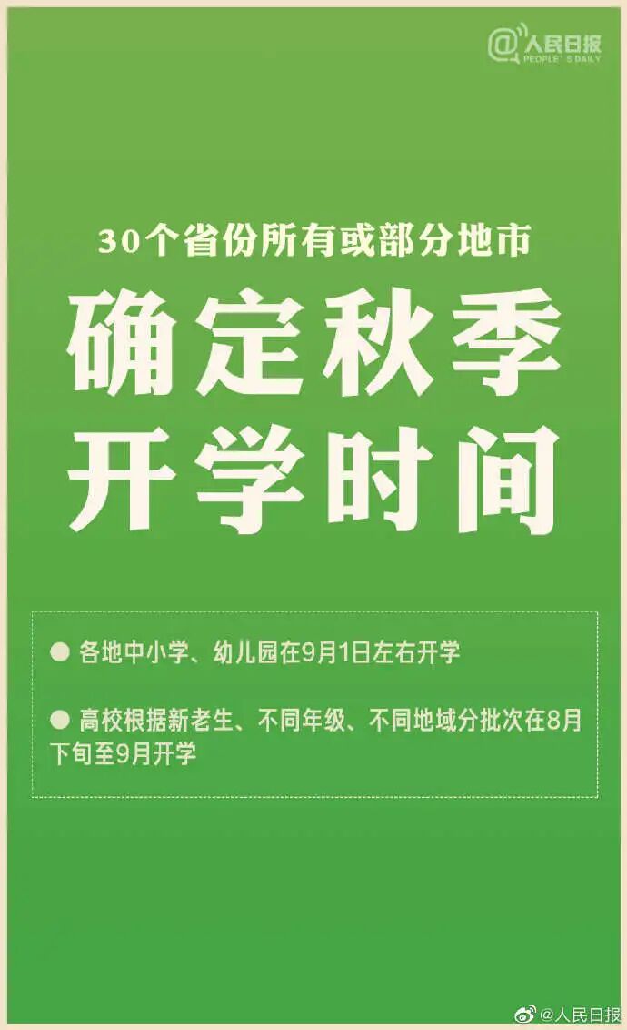 王登峰介绍,30个省份所有或部分地市已确定秋季开学时间,各地中小学、幼儿园在9月1日左右开学,与往年秋季开学时间大致相同。高校根据新老生、不同年级、不同地域分批次在8月下旬至9月开学。75所教育部直属高校中,49所8月底前第一批学生返校,24所9月上旬第一批学生返校,2所9月中下旬第一批学生返校。