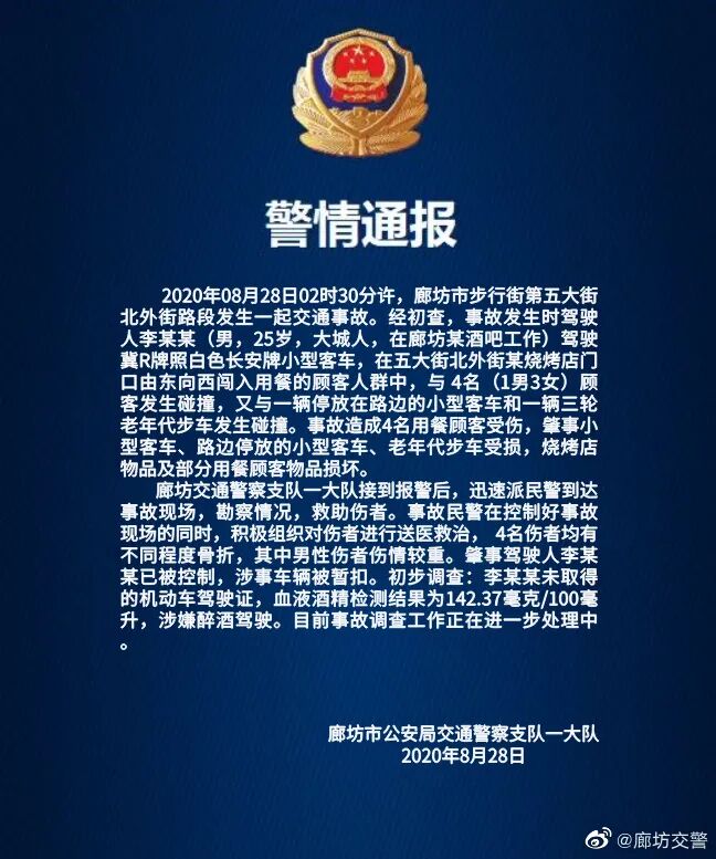 8月28日晚,@廊坊交警公布初步调查结果:2020年08月28日02时30分许,廊坊市步行街第五大街北外街路段发生一起交通事故。