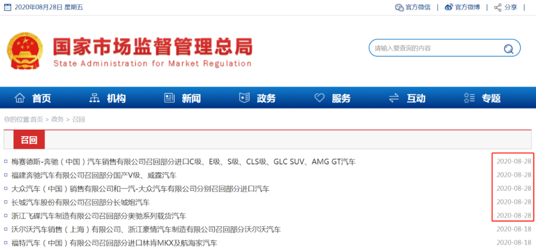 8月28日,国家市场监督管理总局连续发布5条汽车召回信息,涉及品牌有奔驰、大众、长城等,其中包含进口奔驰C级、E级、S级、CLS级、GLC SUV、AMG GT汽车,大众涉及甲壳虫、尚酷及高尔夫系列。
