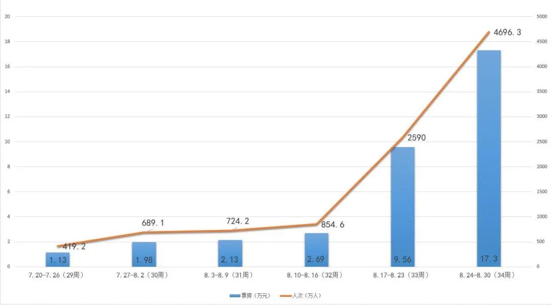综观8月四周票房,呈现明显上升趋势。8月中四周的周票房分别为2.1亿元、2.7亿元、9.6亿元和17.3亿元。8月的最后一周,也成为影院复工以来周票房首次突破10亿的单周。