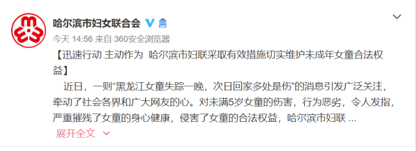 另据@哈尔滨市妇女联合会 消息,近日,一则“黑龙江女童失踪一晚,次日回家多处是伤”的消息引发广泛关注,牵动了社会各界和广大网友的心。对未满5岁女童的伤害,行为恶劣,令人发指,严重摧残了女童的身心健康,侵害了女童的合法权益,哈尔滨市妇联对此表示严厉谴责! 哈尔滨市妇联对此案件高度关注,第一时间与基层妇联进行具体沟通指导,并针对此案成立了市、区、街道、社区四级妇联组织相关人员组成的维权工作专班,全程跟踪关注案件进展情况,全力协调多方力量维护受害女童合法权益。截止目前,哈尔滨市、区两级妇联组织已分别向市、区两级公安局、检察院发出《维权意见函》,要求依法严惩犯罪嫌疑人,切实维护受害女童的合法权益。同时,市妇联协调市卫健委、市儿童医院,积极救治受害女童。 发动相关社会组织和人员,募集救治资金。哈尔滨市妇联分管维权工作的副主席和权益部工作人员及道里区妇联工作人员于9月1日到医院看望女童,并与儿童医院医护人员针对救治工作进一步沟通。下一步市妇联将继续密切关注案件的进展,为受害女童及家长提供相关法律援助、心理疏导等多方面维权服务。 未成年人是祖国的未来,民族的希望,关爱和保护未成年人健康成长是全社会的共同责任。我们强烈呼吁,严厉打击一切侵害儿童的违法犯罪行为,加大对未成年人,特别是儿童的保护力度,强烈呼吁社会各界高度关注儿童安全健康,共同为孩子们成长营造安全和谐的良好社会环境。 这起伤害案件不仅侵害了女童的身心健康,更是社会之患,文明之殇。《未成年人保护法》规定,对侵犯未成年人合法权益的行为,任何组织和个人都有权予以劝阻制止,或者向有关部门提出检举或者控告。为此,我们再次呼吁,要严厉打击对未成年人的违法犯罪行为,进一步加大对未成年人的保护力度。哈尔滨市妇联将联合相关部门进一步完善未成年人侵权案件的发现报告机制和多部门联防联动机制。 社会各界如发现侵害妇女儿童权益的案件线索,请广大群众第一时间拨打110报警,或者拨打12338妇女维权热线,预防悲剧再次发生。 民生大参考、平安道里微警务、@哈尔滨市妇女联合会、猛犸新闻·东方今报