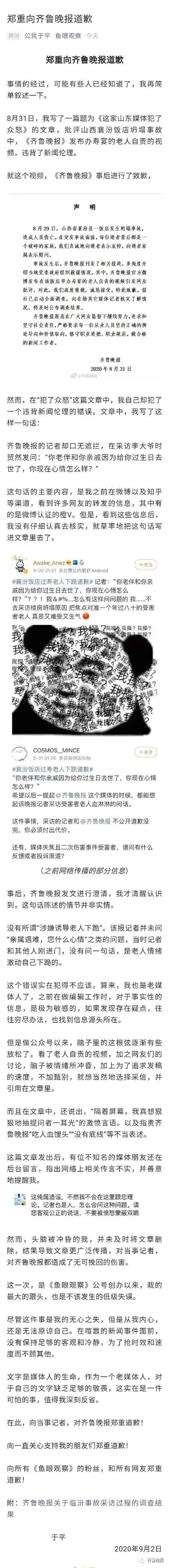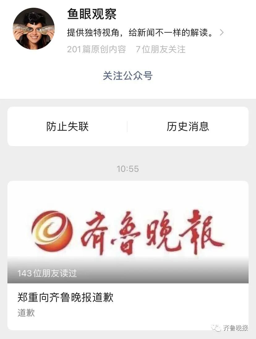 9月2日上午,“鱼眼观察”公众号发布对齐鲁晚报的道歉声明。