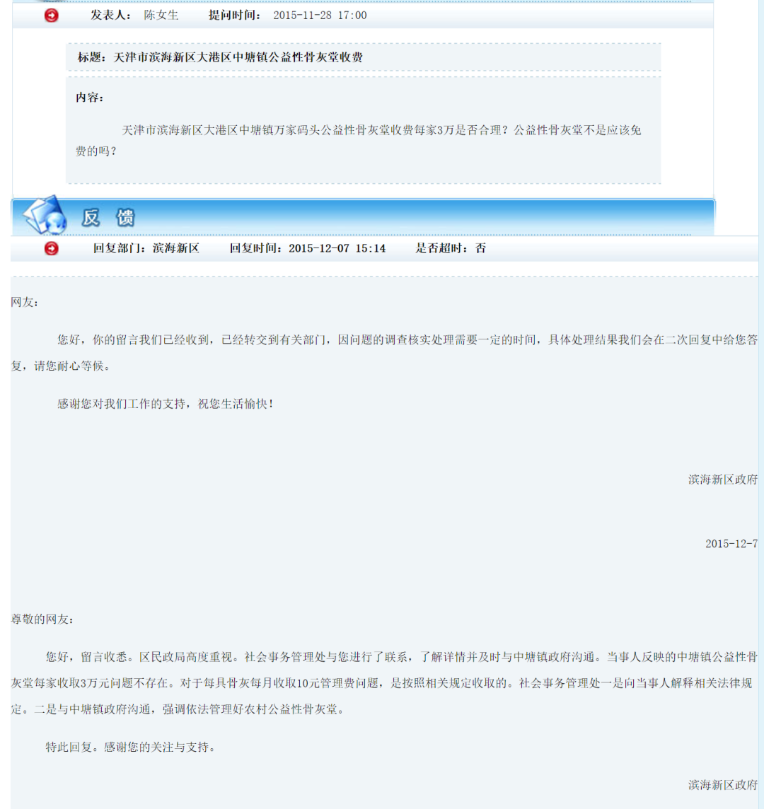 而备注为滨海新区政府的回复则显示:当事人反映的中塘镇公益性骨灰堂每家收取3万元问题不存在。对于每具骨灰每月收取10元管理费问题,是按照相关规定收取的。