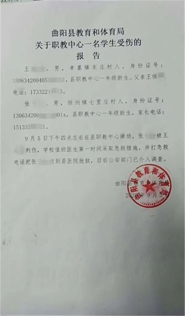 随后记者联系了曲阳县职教中心,一名工作人员称“确定(被刺孩子已死亡),目前学校领导们正在处理此事,现在新生都在军训期间,当时事发时学生们也正在军训,具体的详情不便透露。”