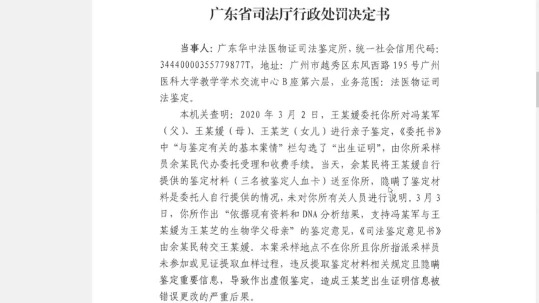 今年8月份,由于根据孩子母亲自行提供的鉴定材料,做出虚假“亲生”鉴定,造成孩子的出生信息被错误更改,广东华中法医物证司法鉴定所被停止从事司法鉴定业务三个月