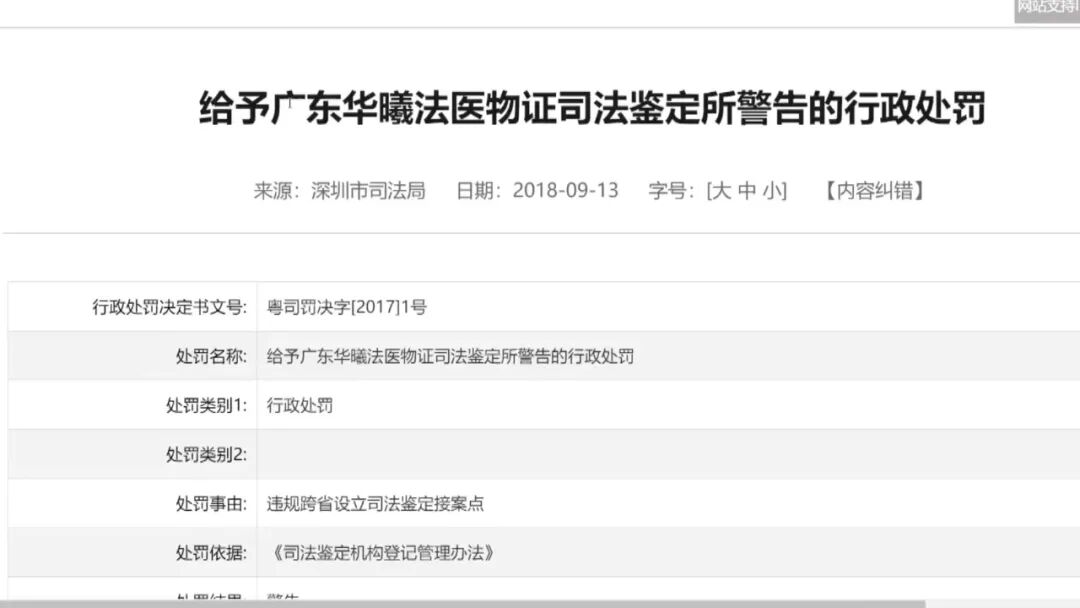 2017年,卢法医所提到的广东华曦法医物证司法鉴定所,就曾经因为违规跨省设立司法鉴定接案点,被广东省司法厅警告。