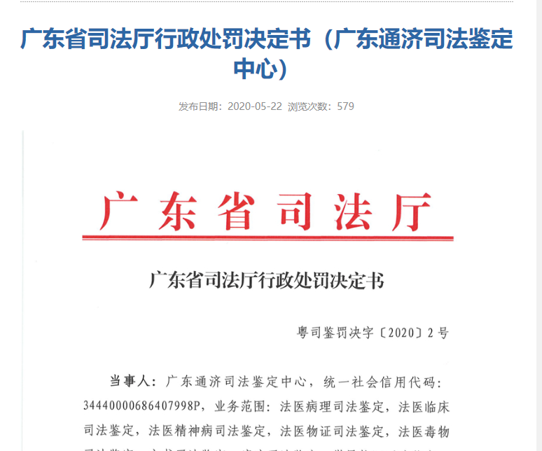 今年5月,广东通济司法鉴定中心因为违规收费被警告。