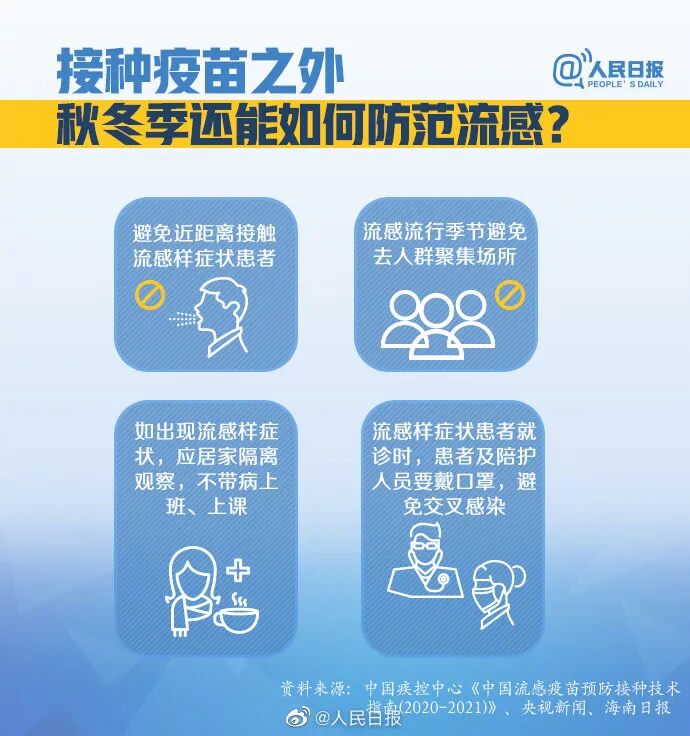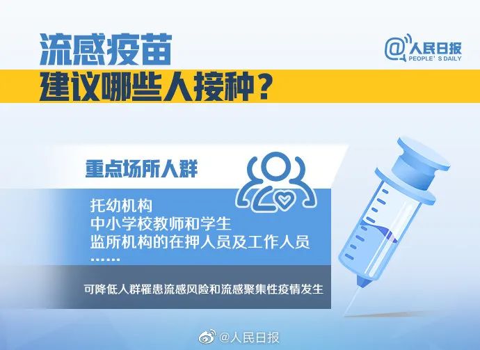 9月11日,中国疾控中心最新发布了《中国流感疫苗预防接种技术指南(2020-2021)》。指南强调:接种流感疫苗是预防流感最有效的手段。结合今年新冠疫情形势,为尽可能降低流感的危害和对新冠疫情防控的影响,推荐对重点和高风险人群进行接种,具体包括医务人员;养老机构、福利院等人群聚集场所脆弱人群及员工;重点场所人群,如托幼机构、中小学校的教师和学生,监所机构的在押人员及工作人员等;老人、小孩、孕妇等其他流感高风险人群。