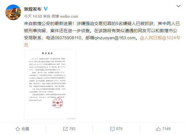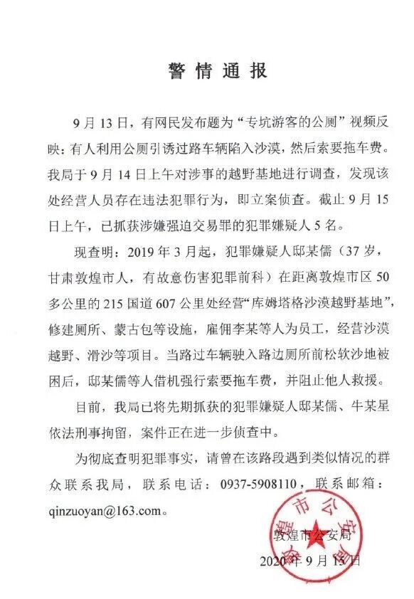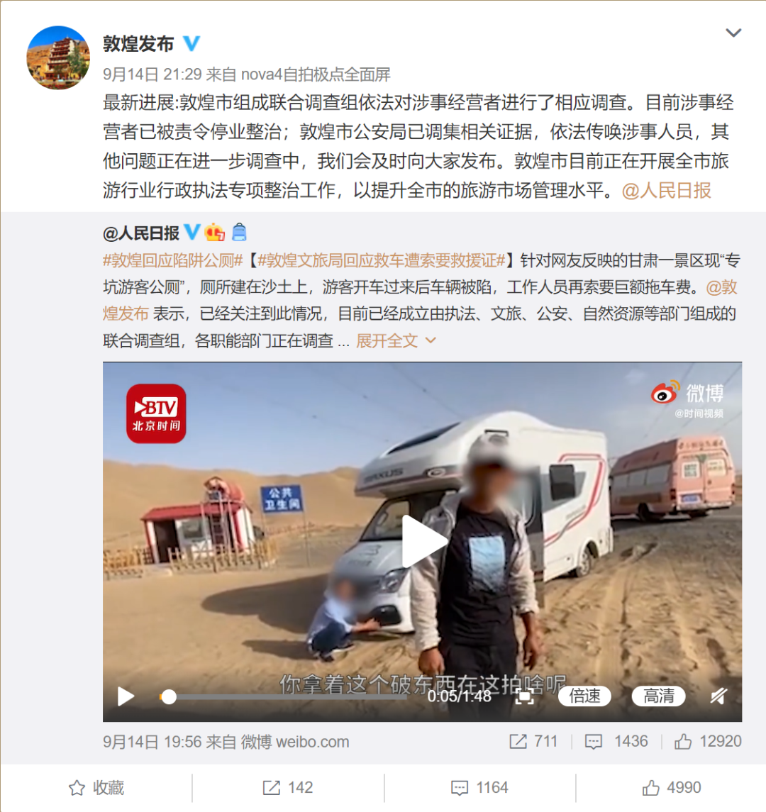 9月14日晚上,甘肃省敦煌市外宣办官方微博@敦煌发布 作出回应:敦煌市组成联合调查组依法对涉事经营者进行了相应调查。目前涉事经营者已被责令停业整治;敦煌市公安局已调集相关证据,依法传唤涉事人员,其他问题正在进一步调查中,我们会及时向大家发布。敦煌市目前正在开展全市旅游行业行政执法专项整治工作,以提升全市的旅游市场管理水平。