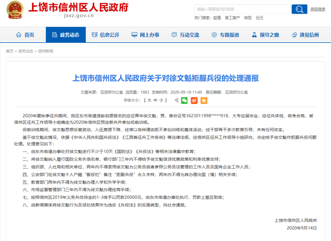 江西上饶市信州区人民政府9月14日发出《关于对徐文魁拒服兵役的处理通报》称,经信州区征兵工作领导小组研究,决定给予徐文魁作拒服兵役问题处理。