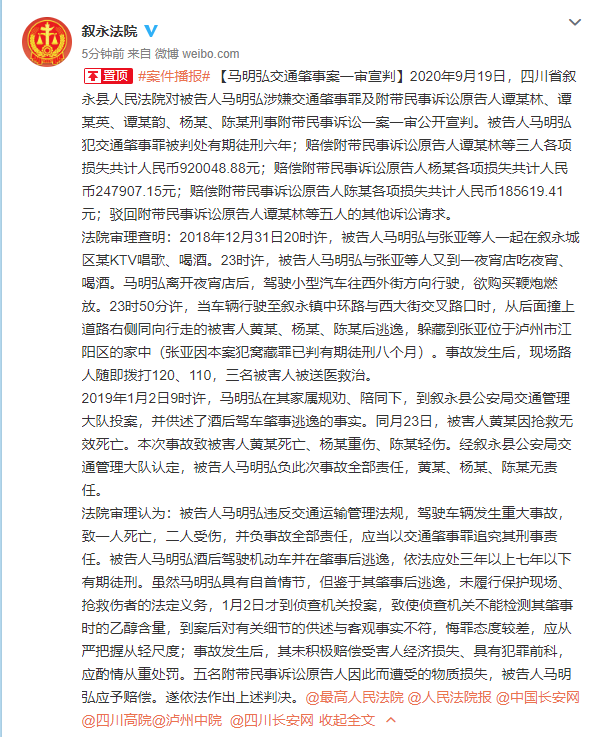 2020年9月19日,四川省叙永县人民法院对被告人马明弘涉嫌交通肇事罪及附带民事诉讼原告人谭某林、谭某英、谭某韵、杨某、陈某刑事附带民事诉讼一案一审公开宣判。被告人马明弘犯交通肇事罪被判处有期徒刑六年;赔偿附带民事诉讼原告人谭某林等三人各项损失共计人民币920048.88元;赔偿附带民事诉讼原告人杨某各项损失共计人民币247907.15元;赔偿附带民事诉讼原告人陈某各项损失共计人民币185619.41元;驳回附带民事诉讼原告人谭某林等五人的其他诉讼请求。