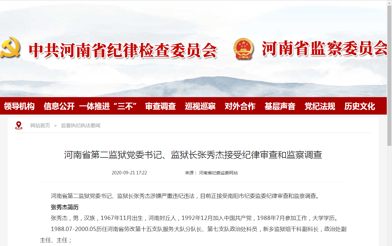 河南省第二监狱党委书记、监狱长张秀杰涉嫌严重违纪违法,目前正接受南阳市纪委监委纪律审查和监察调查。