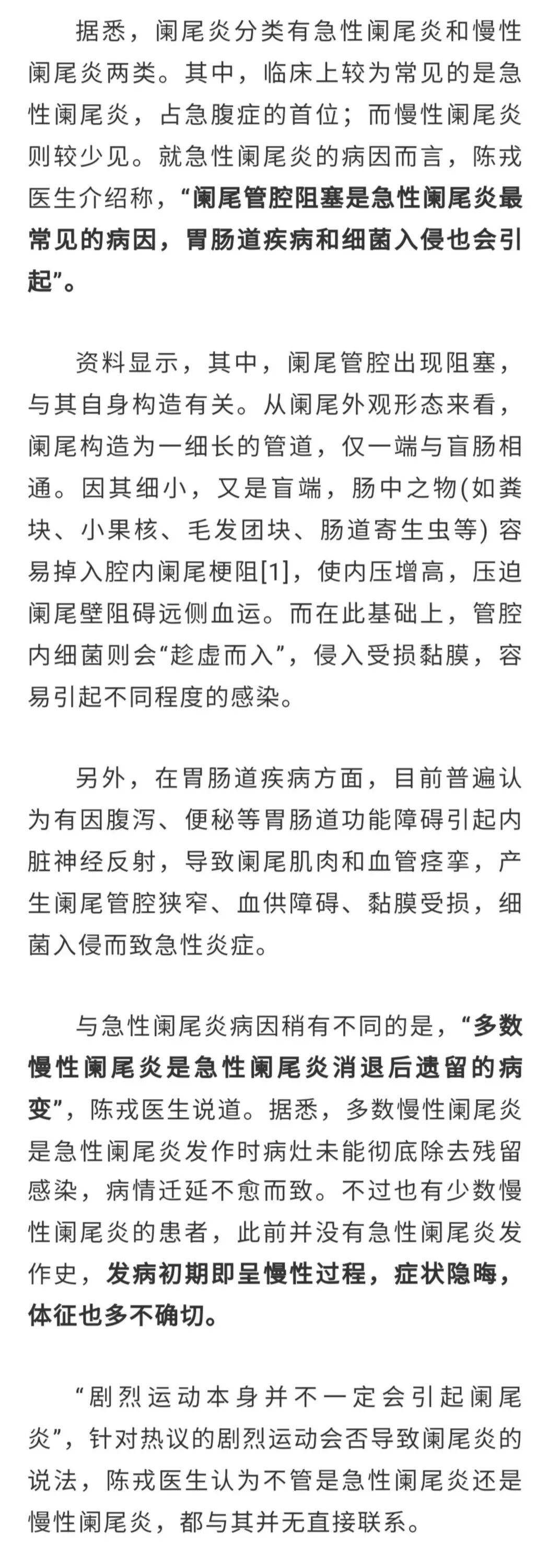 事实上,“人均可能阑尾炎”的背后,其致病因素较为多元。陈戎医生表示,阑尾炎是由多种因素形成的阑尾炎性病变。而若要细究阑尾炎的病因的话,则需分为急性阑尾炎和慢性阑尾炎两类情况进行讨论。