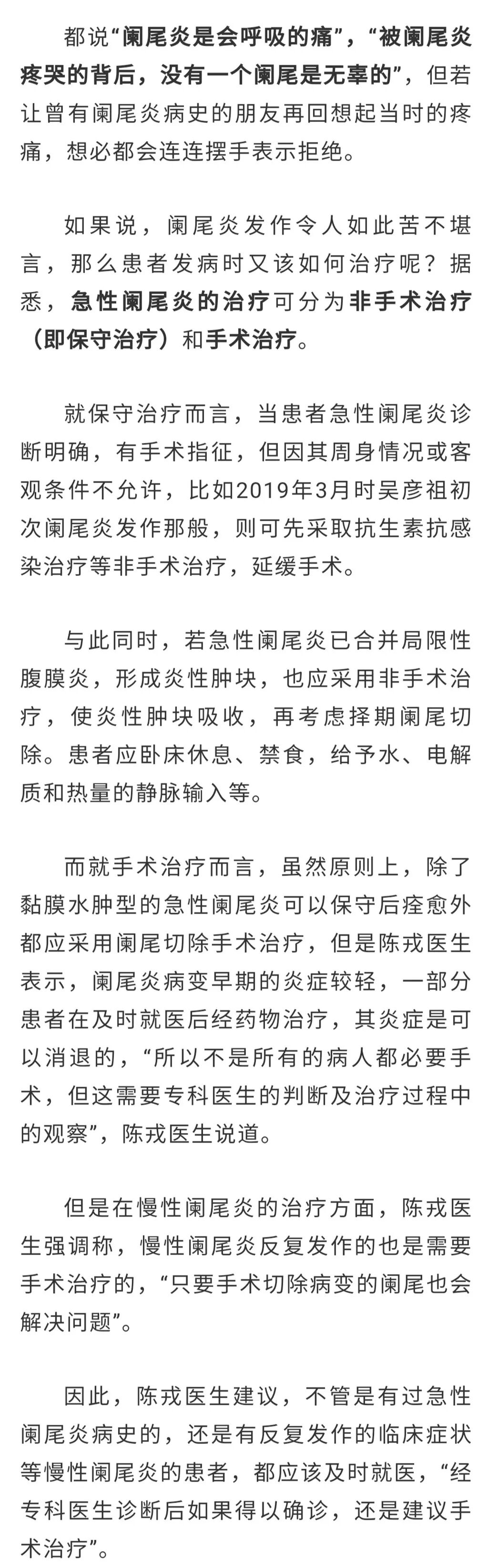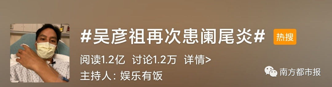 值得注意的是,吴彦祖透露,其早在2019年3月,就已经和阑尾炎“打过交道”了。不过,因为当时还没什么经验的他以为自己只是食物中毒,所以在疼了三天后才去的医院就诊。