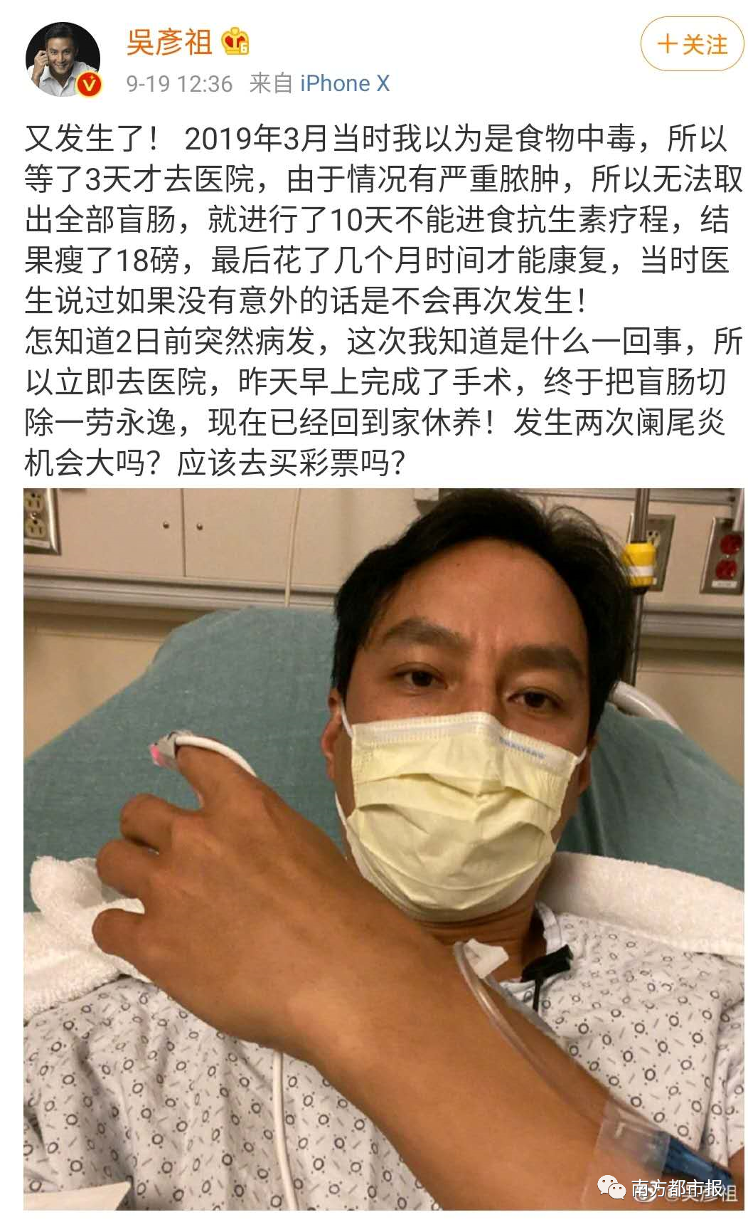 “又发生了!”9月19日,演员吴彦祖在某社交平台上发文称,其近日因阑尾炎复发而决定前往医院进行手术以杜绝后患。