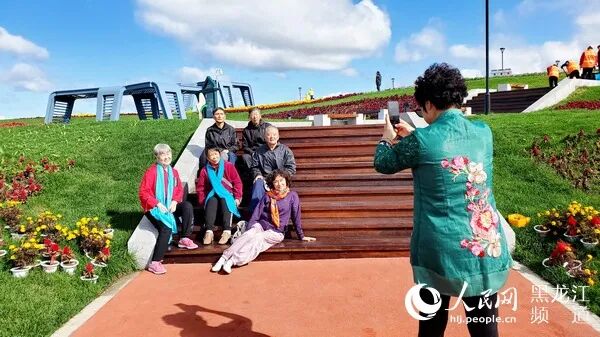 游客们在黑龙江大桥公园内拍照“打卡”。韩婷澎 摄