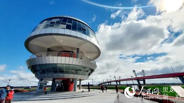 在黑龙江大桥的观光塔上,市民齐先生正在给孩子和远处的大桥合影“打卡”。“自从黑龙江大桥有了观光区,我总会带着孩子来转一转,让孩子也看一看几代黑河人梦想中大桥的样子。”齐先生说。