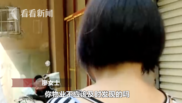 廖女士说:“有个阿姐(时常)在这里拉货,我就问了一下她,她说这个起码有,流了差不多一个月还是一个多月这样,一直流着哗啦哗啦地流着那个水,那我就觉得奇怪了,你物业不应该及时发现的吗?不应该有巡逻的吗?”