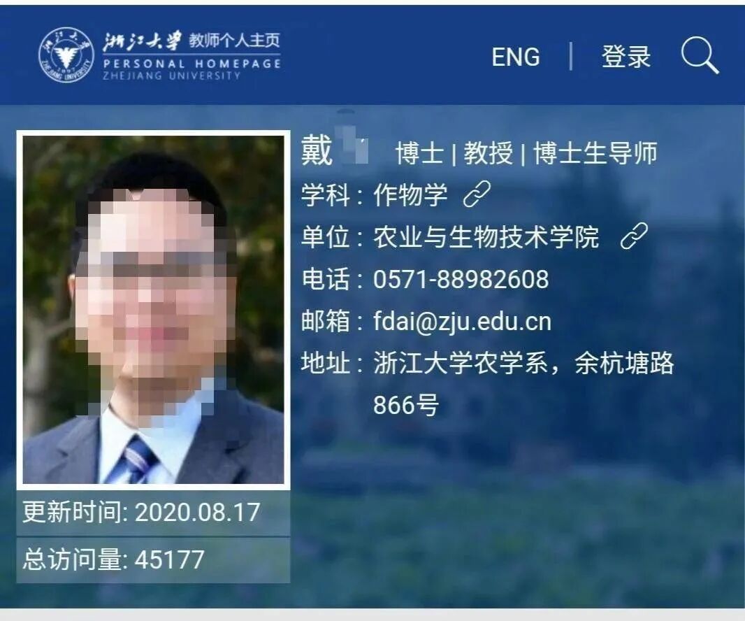 记者在浙江大学教师个人主页看到,戴某于1980年出生,浙江嘉兴人,作物学博士,教授,中国农学会理事,浙江省杰出青年基金获得者,现工作于浙江大学农学院作物科学研究所, 2016年12月至今在浙江大学农业与生物技术学院担任教授。