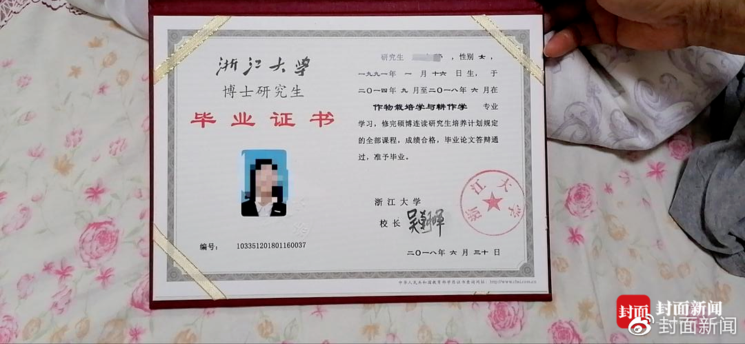毛女士介绍,2013年,小蕾从河南农业大学毕业后,以外保研究生的身份进入浙江大学农业与生物技术学院农学系就读,2014年转为硕博连读,成为该学院戴某的“开门弟子”。2018年6月毕业时,取得浙江大学的博士研究生证书和学位证书。